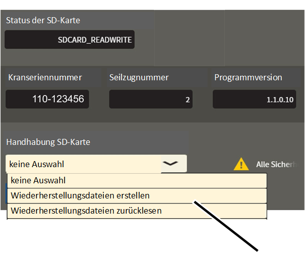Auf der SD-Karte kann zusätzlich zu der kundenspezifischen Konfiguration, die beim Starten des Krans mit dem Flashspeicher der SPS verglichen wird, eine separate Datensicherung der kundenspezifischen Konfiguration angelegt werden.
