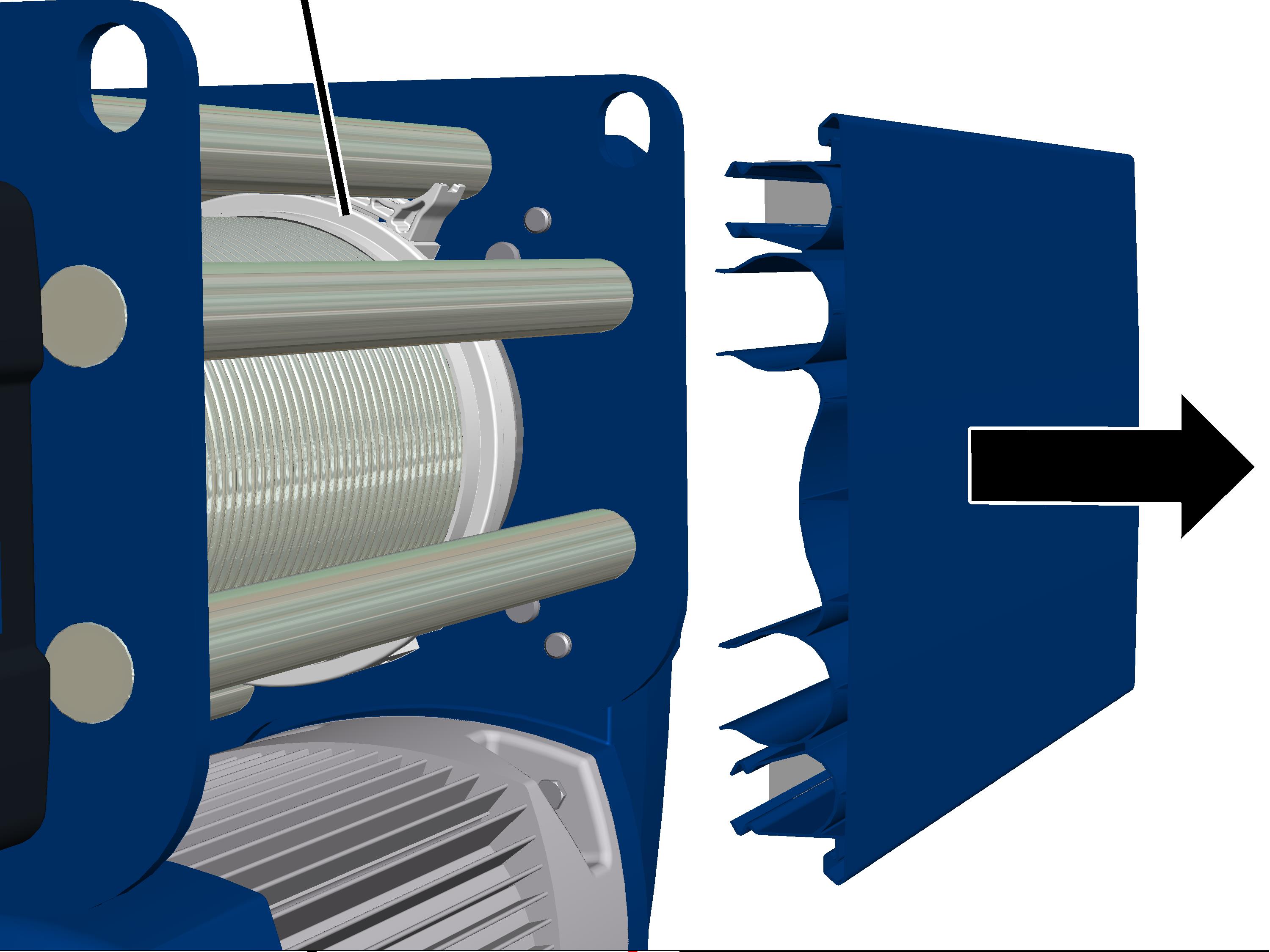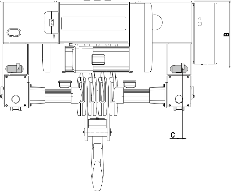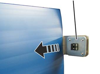─ Bei Distanzsensor Katzfahrt am Seilzug GM modular: Der Distanzsensor wird an einer Halterung seitlich in die Abdeckung der Seiltrommel geschoben. Der Reflektor wird am Fahrwerksträger des Krans als Klebefolie aufgeklebt oder an einem Quadratrohr befestigt.
