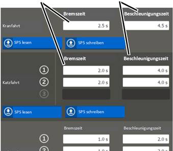 ─ „Bremszeit“: Zeit, in der der Fahrantrieb von der Fahrgeschwindigkeit laut Typenschild bis zum Stillstand abbremst. Bei einem niedrigen Wert bremst der Kran (oder die Katze) schneller, bei einem hohen Wert langsamer. Die kürzeste und längste Zeit, die eingestellt werden kann, wird bei der Eingabe im Tastenfeld angezeigt.