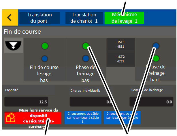 Ici, la fenêtre correspondante peut être sélectionnée pour chaque axe de mouvement du pont (translation du pont, translation du chariot de direction, mécanisme de levage). Le système affiche uniquement les axes de mouvement du pont qui sont en effet disponibles pour le pont en question.
