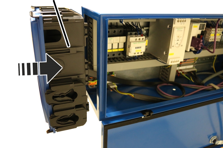 For cranes with short end carriages, the wiring and the cable entry housing are on the crane control in front of the high-tensile bolt. The cable entry housing must be removed in order to be able to tighten or loosen high-tensile bolts.