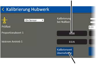 ● The current value is saved as the test load and displayed in the "Proportional value" field in the column "Calibration at test load".