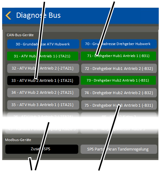 ● All bus devices which are not available on the current crane according to the customer-specific configuration appear with a grey background.