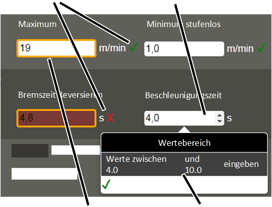 ● If the new value lies within the permitted value range, a green tick appears next to the input field.