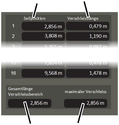 ─ The "Wear length" column shows the length of the respective wire rope section exhibiting pronounced wear. This is measured from the start of the position given in the "Rope position" column.