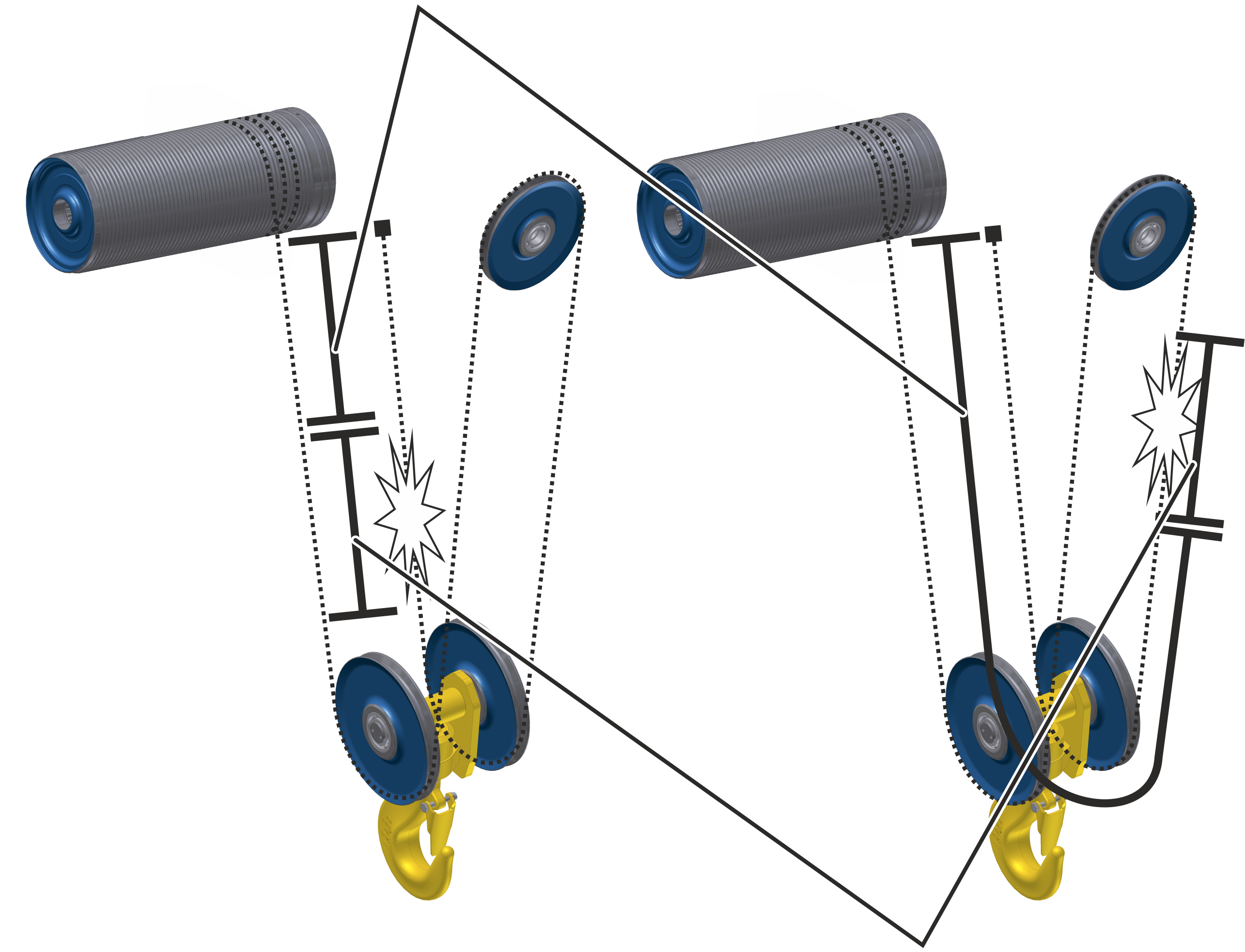 This section applies only to wire rope hoists with a twin hoist (not one but both wire rope ends are each wound onto their own cable drum) and wire rope hoists with a True Vertical hoist (not one but both wire rope ends are wound together onto a shared cable drum).