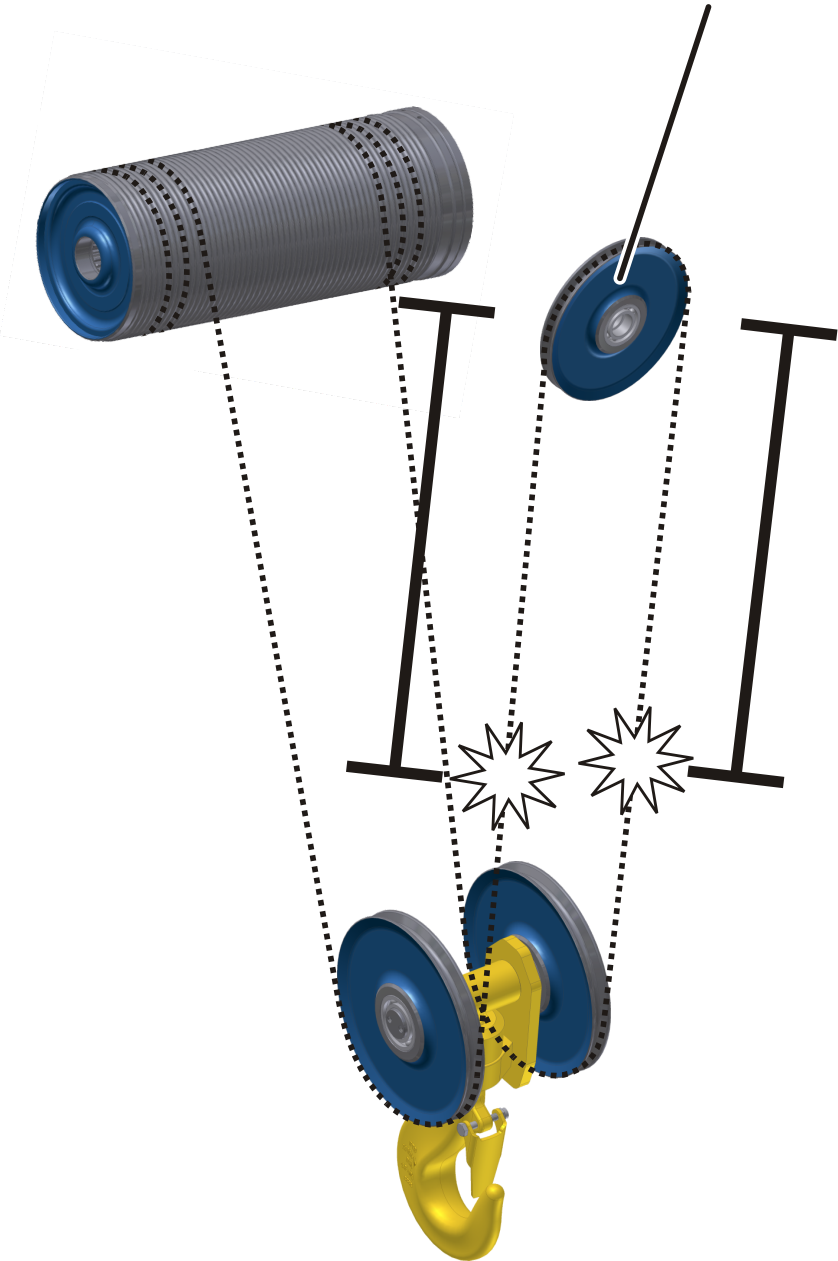 These wire rope hoists wind the wire rope at both ends. The middle wire rope piece remains nearly motionless on the compensating sheave of the wire rope hoist or the bottom block. The compensating sheave functions as a fixed point and the two wire rope halves are considered two individual wire ropes.