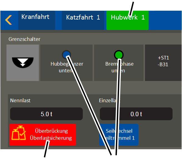 ─ Button (red background): Buttons with safety-relevant functions (e.g. Bypass overload protection) have a red background as soon as they are switched on (active).