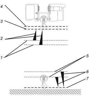 ─ 3: Switching point of the top hoist limiter. If it is activated, the load hooks remains stationary. Due to the individual beginning of the brake phase and the adjustable strength of the brake phase, the load hook only lifts with slow lifting speed shortly before reaching the top hoist limiter.