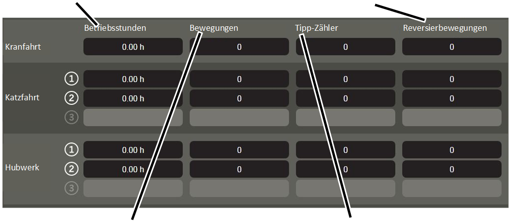 ─ "Motions": Number of motions of the respective crane axis. In each case, a motion is counted if the corresponding drive accelerates from a standstill.