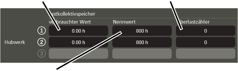 ─ "Overload counter": Number of lifting motions with overload. The number always increases by 1 if the hoist lifts a load that is over the maximum load capacity of the crane. At the same time, the "Motions" description field also increases by 1.