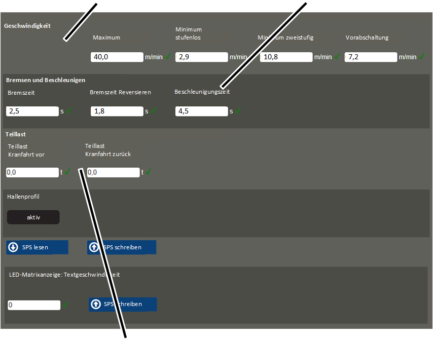 ─ Only with crane travel profile: "Part load crane travel ahead" and "Part load crane travel back": Load as of which the load-dependent crane distancing system is to be switched on. See Displaying the status of the crane axes [1] [2]. The load can be separately set for both travel directions.