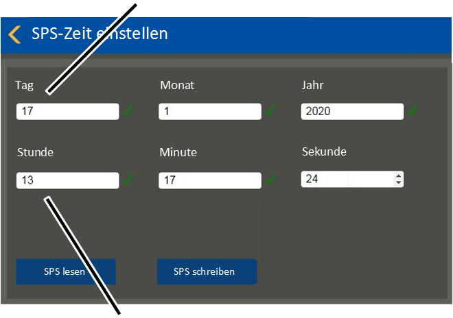 User "Service" or "Abnahme" (commissioning) à "PLC diagnosis" à "Set PLC time" |