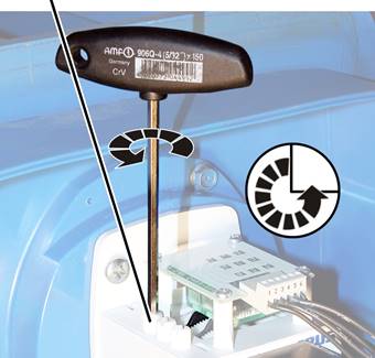 ─ Avec la fin de course de réducteur avec trois points de commutation : la fin de course levage bas est ajustée avec la vis de réglage blanche la plus à l'avant.