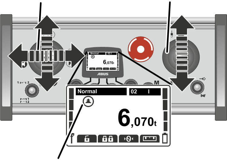 ● Auf dem Display wird die Richtung von Kran, Katze und Lasthaken angezeigt.