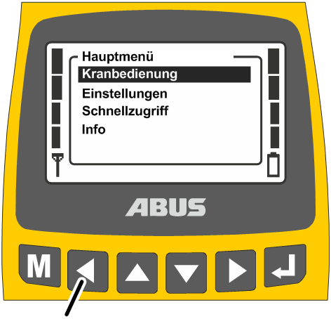 ─ 8: Symbole für Kranfahren, Katzfahren, Heben/Senken: Auf dem Display wird das entsprechende Symbol für die Taster angezeigt. Siehe Kran bedienen.