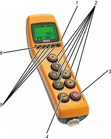 ─ 1: Kran-Nummer: Auf dem Display wird die Kran-Nummer (01, 02,…) angezeigt, an dem der Sender eingeloggt ist.