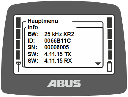 Im Hauptmenü kann ein elektronisches Typenschild angezeigt werden. Hier werden unterschiedliche Informationen über ABURemote angezeigt.