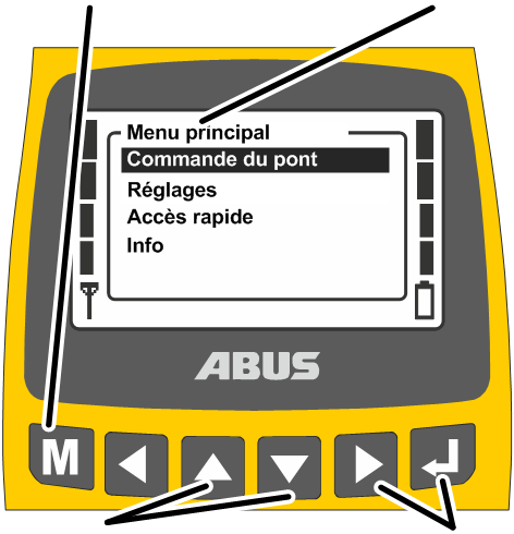 Au sein du menu : utilisation du menu (LEVAGE, DESCENTE, TRANSLATION DU CHARIOT DE DIRECTION VERS LA GAUCHE et TRANSLATION DU CHARIOT DE DIRECTION VERS LA DROITE). Voir « Utilisation du menu ABURemote ».
