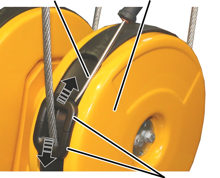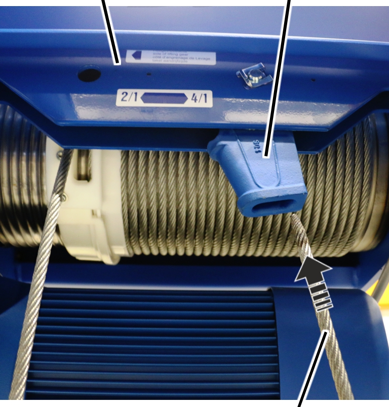 Normalmente se puede obviar el ajuste del interruptor de fin de carrera de elevación tras el cambio del cable en muchos casos, ya que la posición del gancho de carga se ha medido antes y se ha realizado al final un desplazamiento hasta ella. En casos especiales (cuando el cable estaba muy dañado o mal enrollado en el tambor) puede ser necesario reajustar de nuevo los puntos de conmutación.