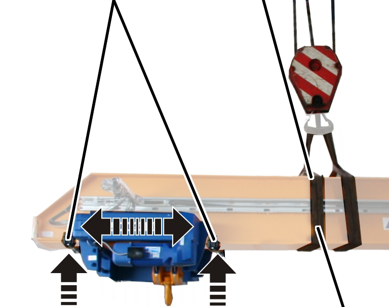 Cuando el carro esté montado debajo de la viga principal: los caballetes deberán ser lo suficientemente altos para que el cable no se pueda ser doblado ni aplastado. Lo ideal es que los caballetes sean lo suficientemente altos para que el gancho de carga del carro cuelgue libremente.