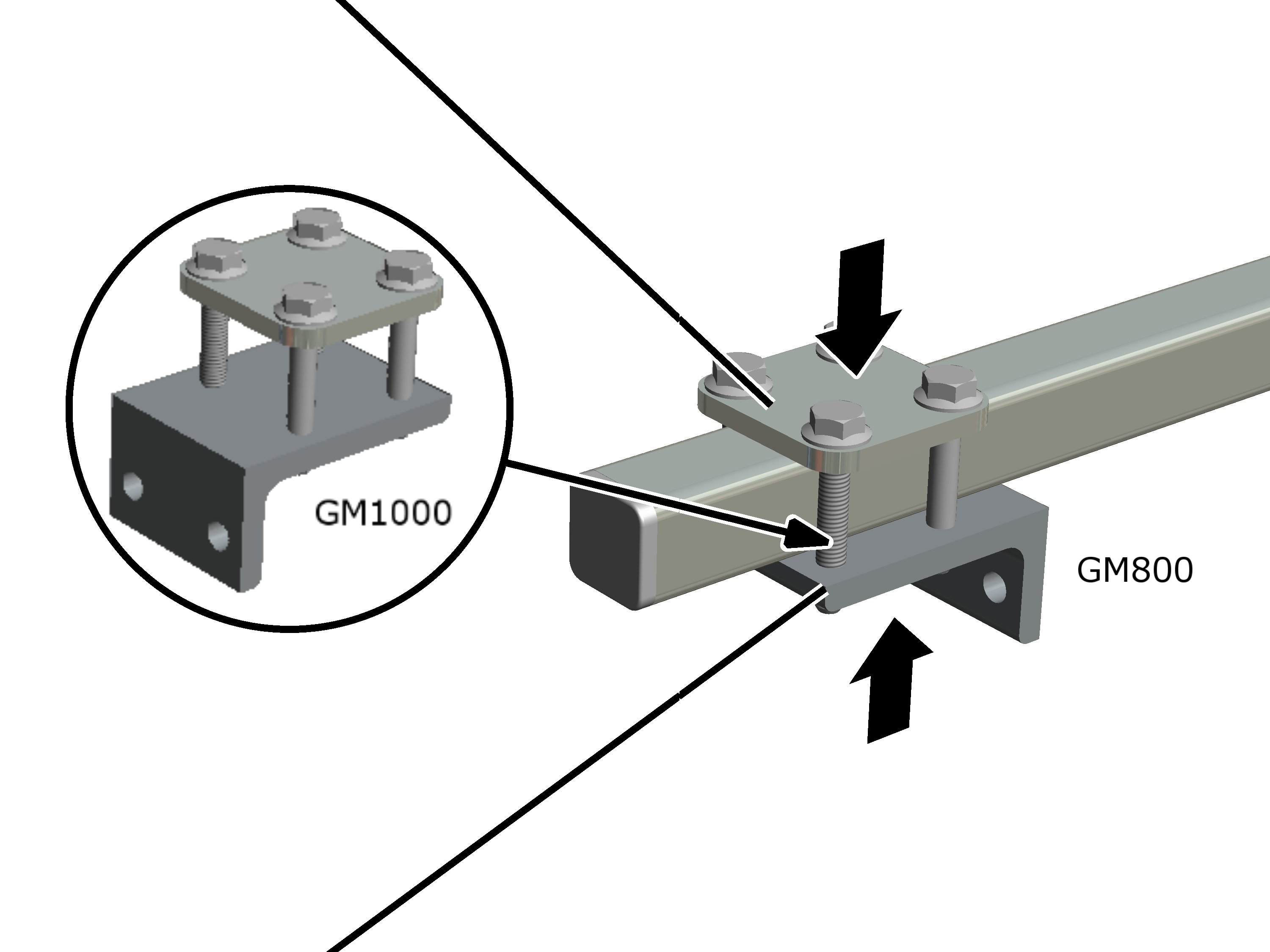 Bei GM1000: Die Befestigungswinkel zeigen nach innen, werden aber mit dem Schenkel des Befestigungswinkels von außen an die Seitenwand des Katzrahmens gelegt und angeschraubt.