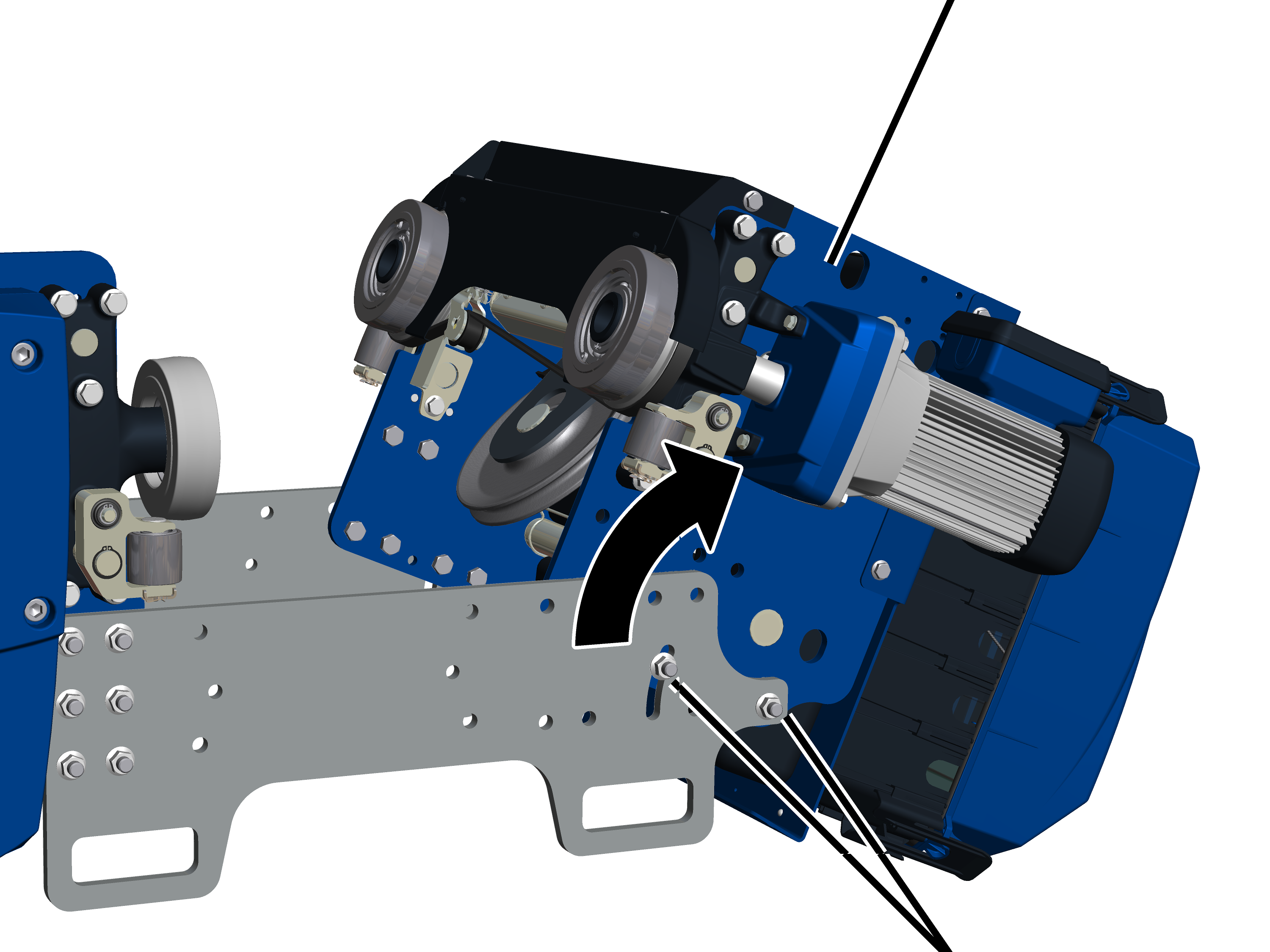 Spurführungsrollen nicht beschädigen! Stoßen die Führungsrollen des Seilzugs gegen den Hauptträger, können die Führungsrollen beschädigt werden. Seilzug genau in Position bringen und vorsichtig bewegen. |