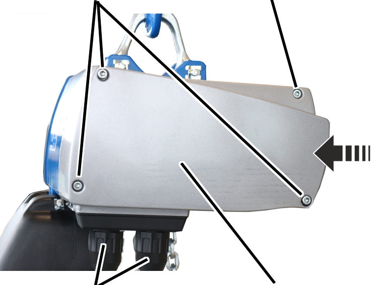 ─ Bei GM6 und Kettenspeicher mit Metallrahmen: Kettenspeicher mit einem Bolzen am Kettenzug befestigen. Die inneren Löcher der Aufhängelaschen verwenden. Die äußeren Löcher der Aufhängelaschen bleiben frei.