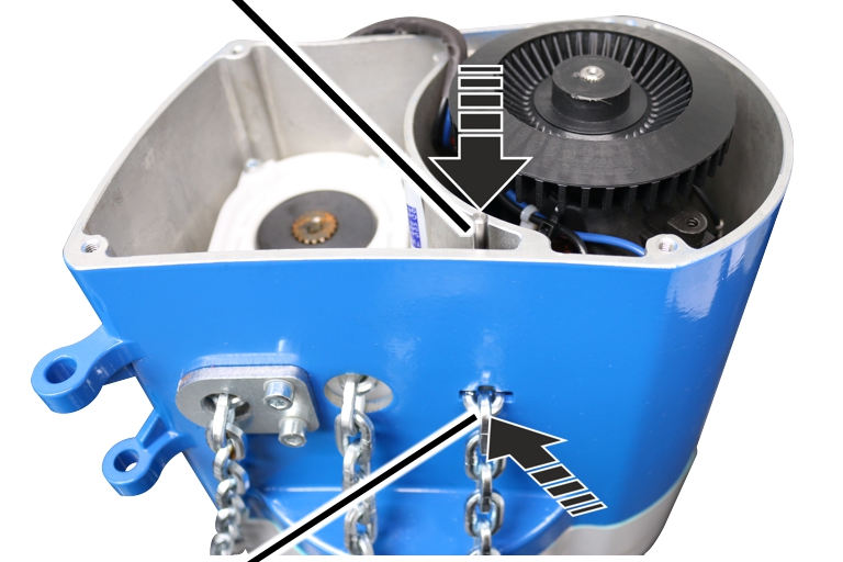 Because of the modular construction of the chain hoist, the gear unit does not need to be disassembled in order to exchange the chain guide and chain sprocket. Instead, the motor cover is removed and the chain sprocket is then exposed.