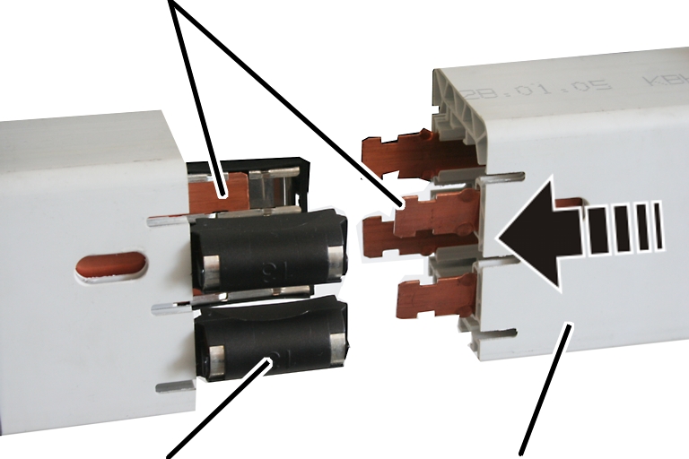 ● En el extremo izquierdo de los tramos, los conductores tienen una forma que impide que se deslicen al interior del carril tomacorriente.