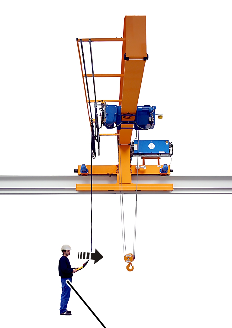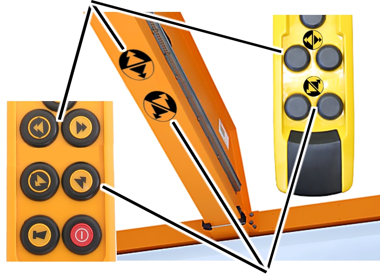 In this position, the directions of the operating direction signs (arrows) on the pendant control match the actual direction of travel of the crane and the trolley.